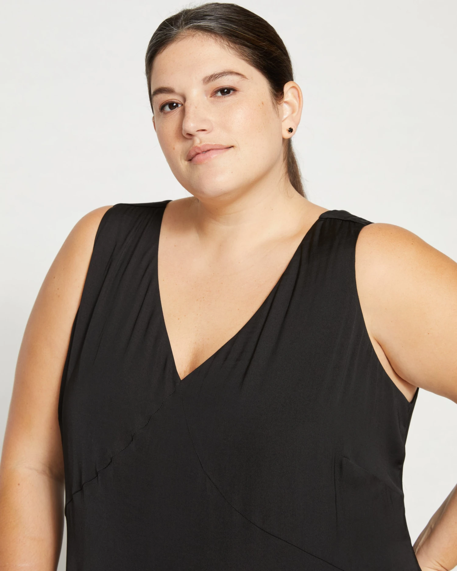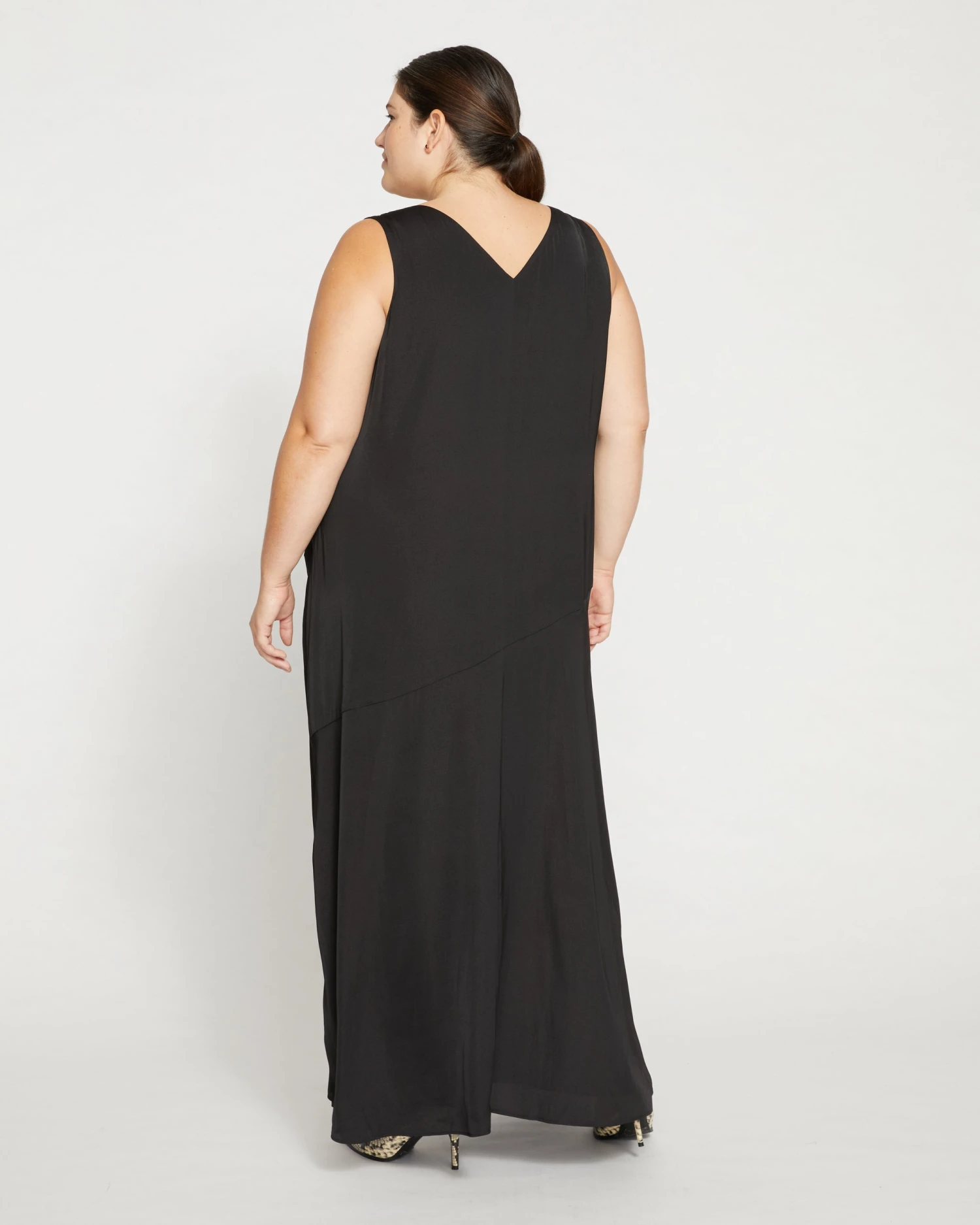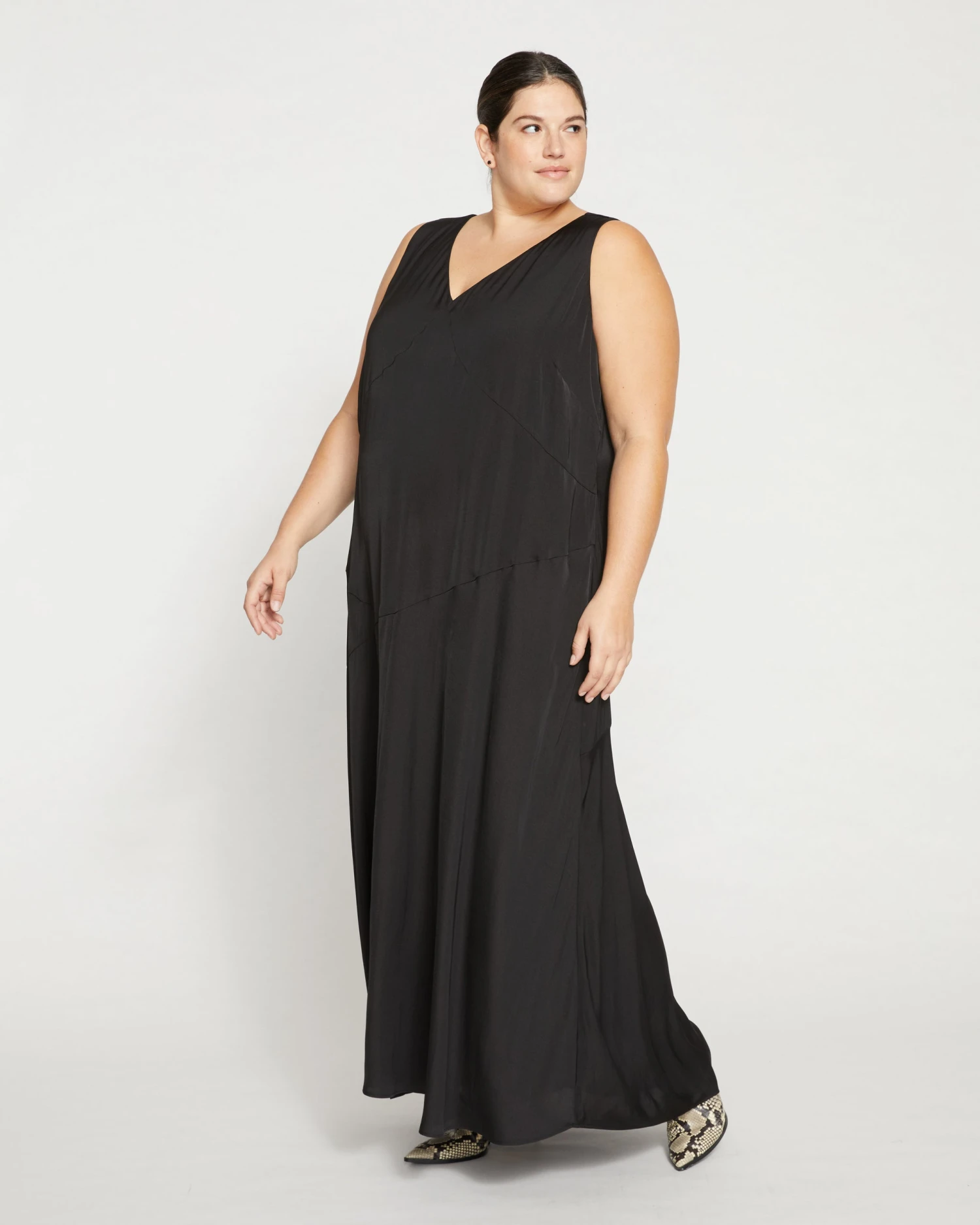 The perfect dress. Long, elegant, flowy… where has it been all your life? Doesn’t matter. It’s here now. Cut from smooth stretch satin, this dress floats over the shape of your body and moves with you. It features a V neck and back and self lining. A minimalist’s dream.