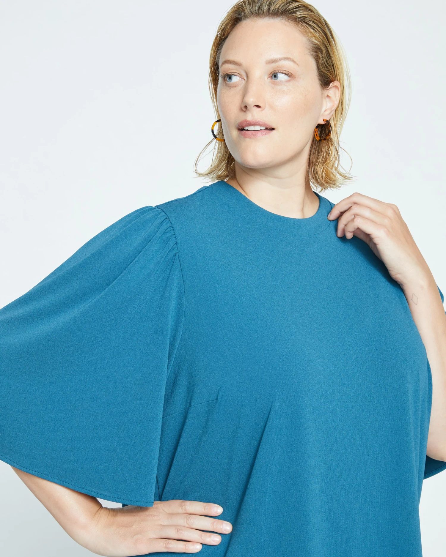 A little bit of-the-moment and a little bit old Hollywood glam, this cape-style top is soft and drapey in our fine crepe jersey – an elevated fabric that looks extremely luxurious but feels breathable and comfy. Slip it on and look effortlessly elegant from day to night. In addition to the dramatic, elbow-length a-line sleeves, details include delicate shirring at the shoulders and a high neck and back snap closure.