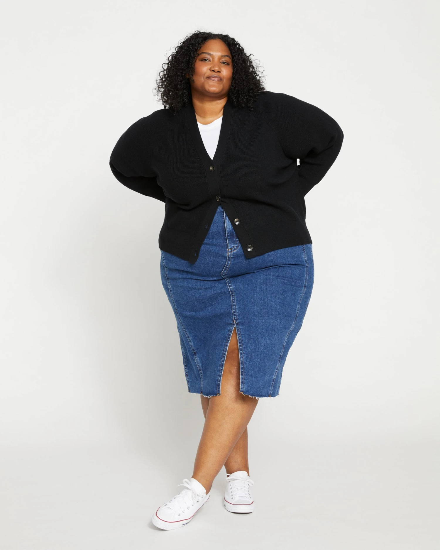 This is the denim skirt of your dreams. It’s part bohemian, part western, and part fashionably modern. The perfect pencil silhouette is made from our soft denim fabric with invisible stretch and boasts a brand-new wash. With a mid-rise fit, it features a subtle deconstructed look with patchwork seaming and a raw hem. We paid particular attention to the trims and finishesโthe raw hem looks clean and intentional, and the custom topstitching was chosen just for this skirt.