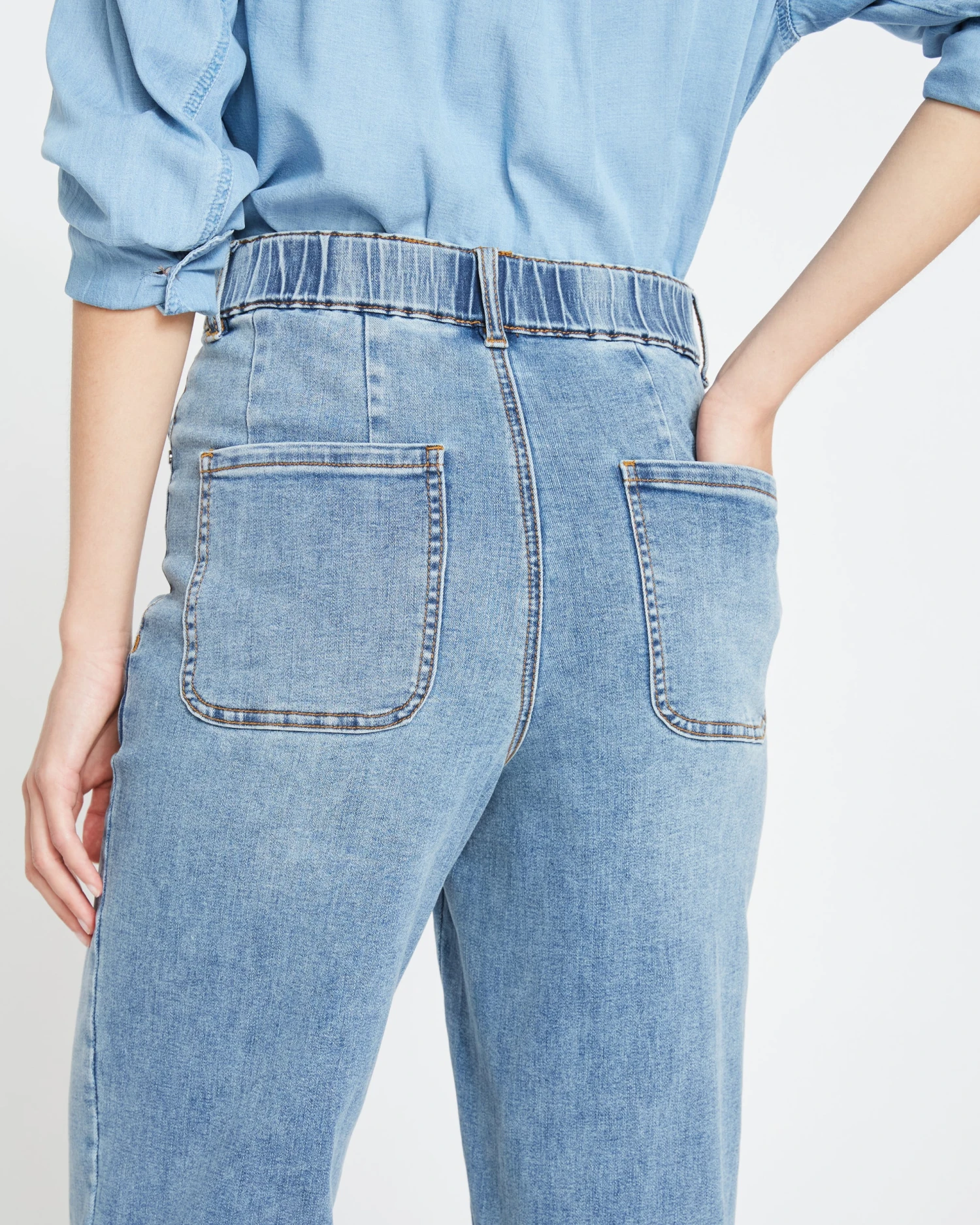 Meet your new favorite off-duty denim. Super stretchy and supremely soft, they’ve got a mid-rise with an ultra-comfortable elastic back waist and fall to a drapey, slightly tapered leg. We’ve also removed the traditional back yoke and added shaping darts for the perfect fit. Finishing touches include four-pocket styling and a zip fly with value fastening.