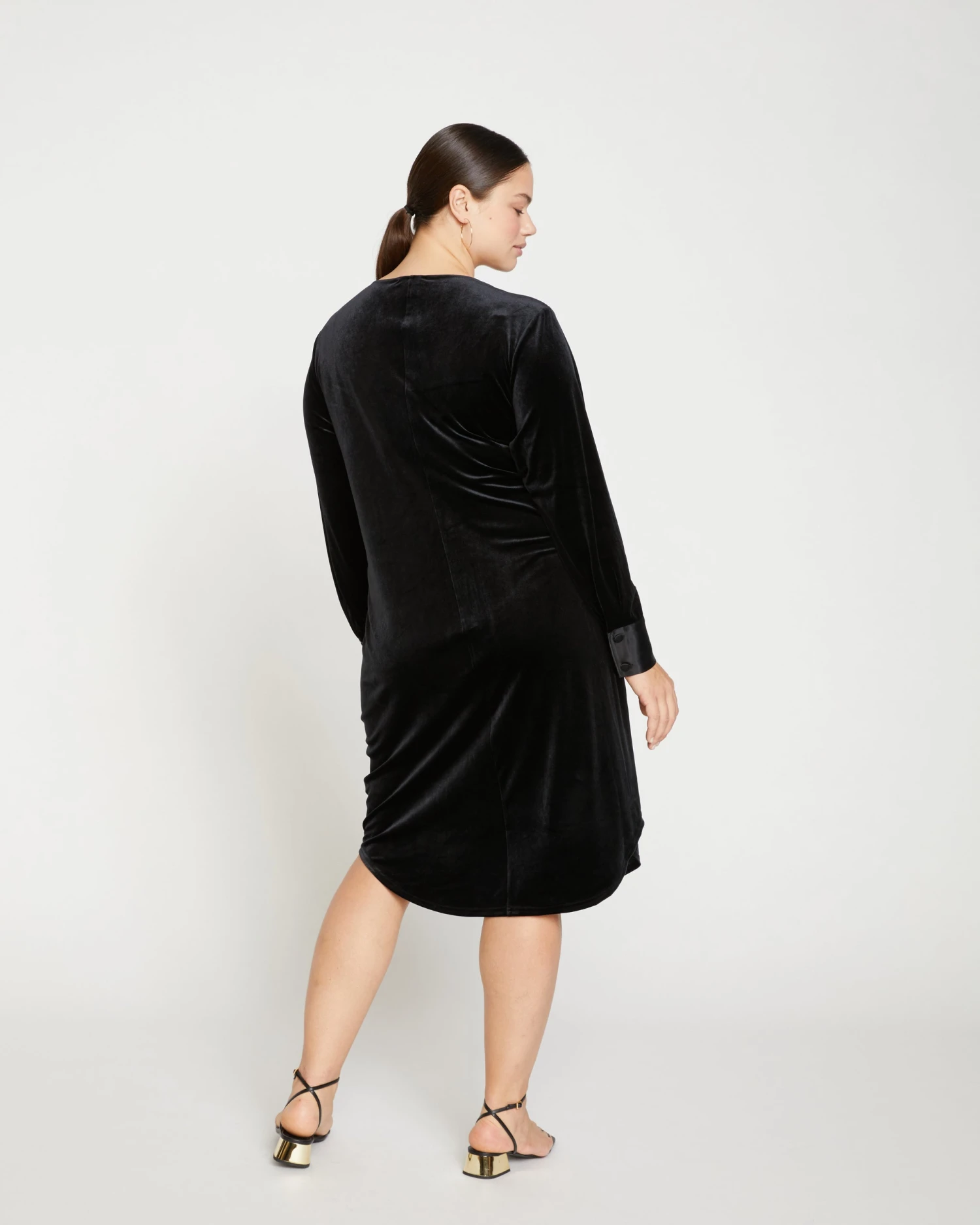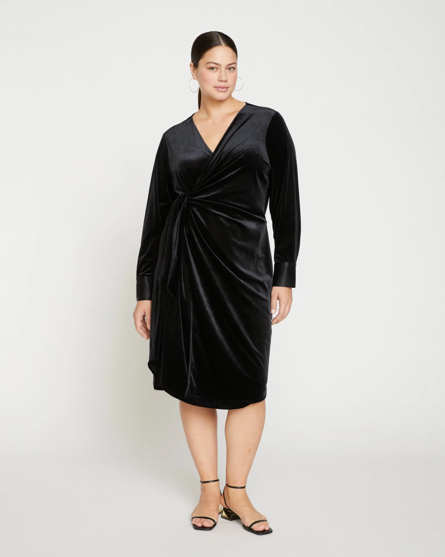Wrap yourself up in this luxurious stretch velvet dress. It features functional ties inside and out with a V-neckline and tonal double luxe cuffs. Additionally, it has a curved hem with side slits. There’s a sultry, vintage ‘le smoking’ vibe to this style and we’re obsessed.
