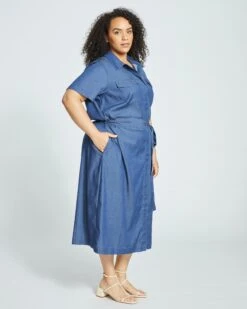 Chambray like no other. Our super-soft, smooth and stretchy chambray feels cool and moves with you. Supremely comfortable, this western-inspired shirt dress features a stunning sweetheart back yoke, shoulder epaulets, and easy-fit short sleeves. Plus, the pockets include hidden values so that the flaps can sit flat and be secured.