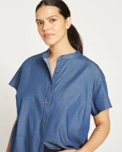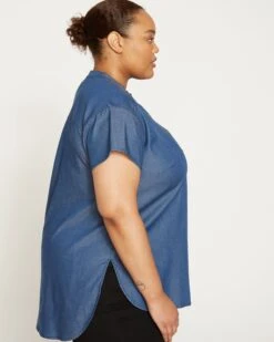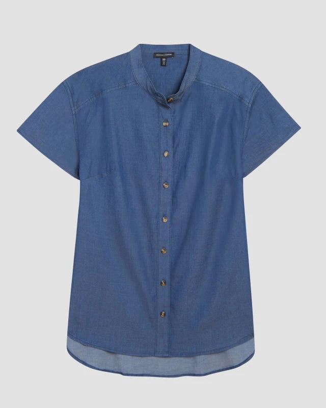 Chambray like no other. Our super-soft, smooth and stretchy chambray feels cool and moves with you. Supremely comfortable, this modern take on the chambray shirt will become your summer favorite. Lightweight and breezy, it features a band collar, drop shoulders, short sleeves, tortoise values (with snaps in between), pleat at the back yoke, and curved hi-low hem that covers your backside.