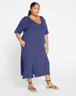 Consider this dress liquid courage. Itโs smooth, fluid, and will instantly change your mood. The fit and flare silhouette is simple but strongโit will skim your body and drape beautifully to mid-calf. Made from jersey fabric as soft as it is bouncy, this is the elevated everyday dress that you can style for daytime or evening (with a good pair of heels). Special details include the V-neckline, nearly elbow-length sleeves, hidden zip pockets, and front slit. Of course, you can still wear this style with slip shorts. Itโs slit at the right length to keep them hidden and show a little leg.
