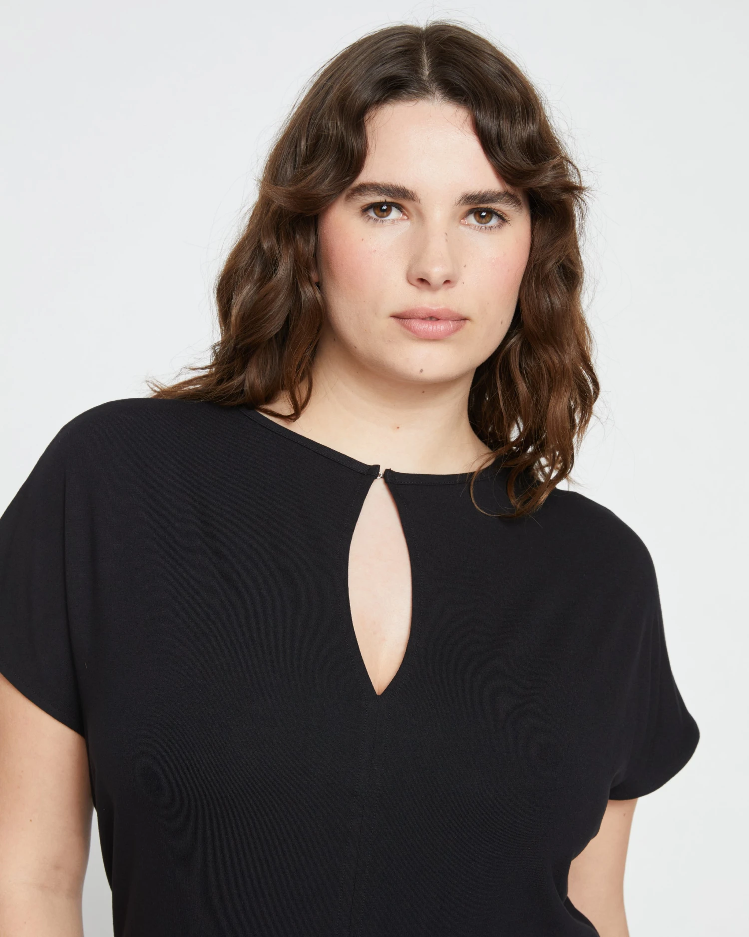 This is your spring-summer shift dress. It’s made from our softly structured divine jersey that has a luxe look and feel. Elegant and classic with the comfort of your favorite pajamas. This sleek dress features a beautiful drape and will move with you easily. Key details include the hook and eye neckline, that can be worn open or closed, and a front slit from the hem. Wear this one from your desk to your dinner table. Cheers to versatility!