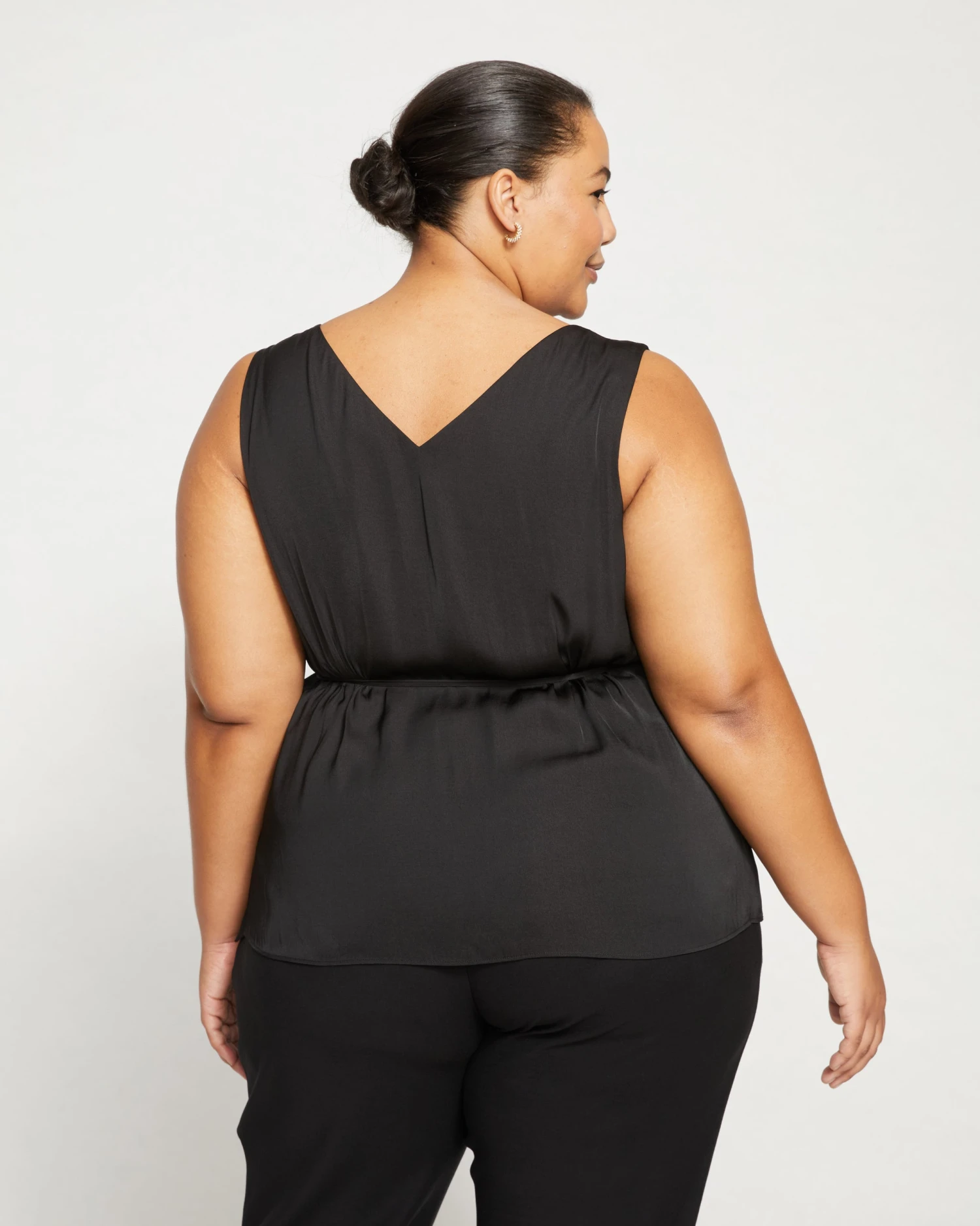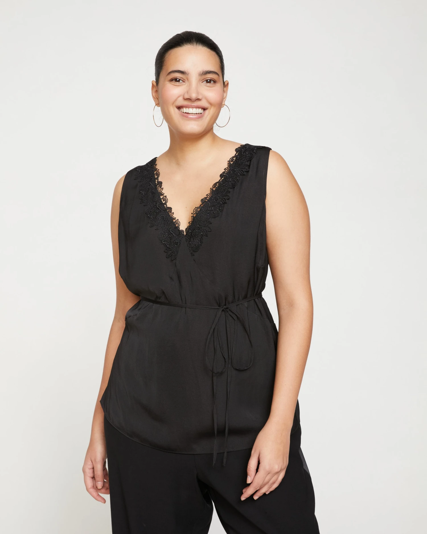 Your fanciest lingerie but make it a top. Sweet and elegant, this sleeveless stretch satin blouse features delicate lace detailing along the neckline and a string to cinch the waist. Dress up your jeans and wear it with pants to look sophisticated in the evening.