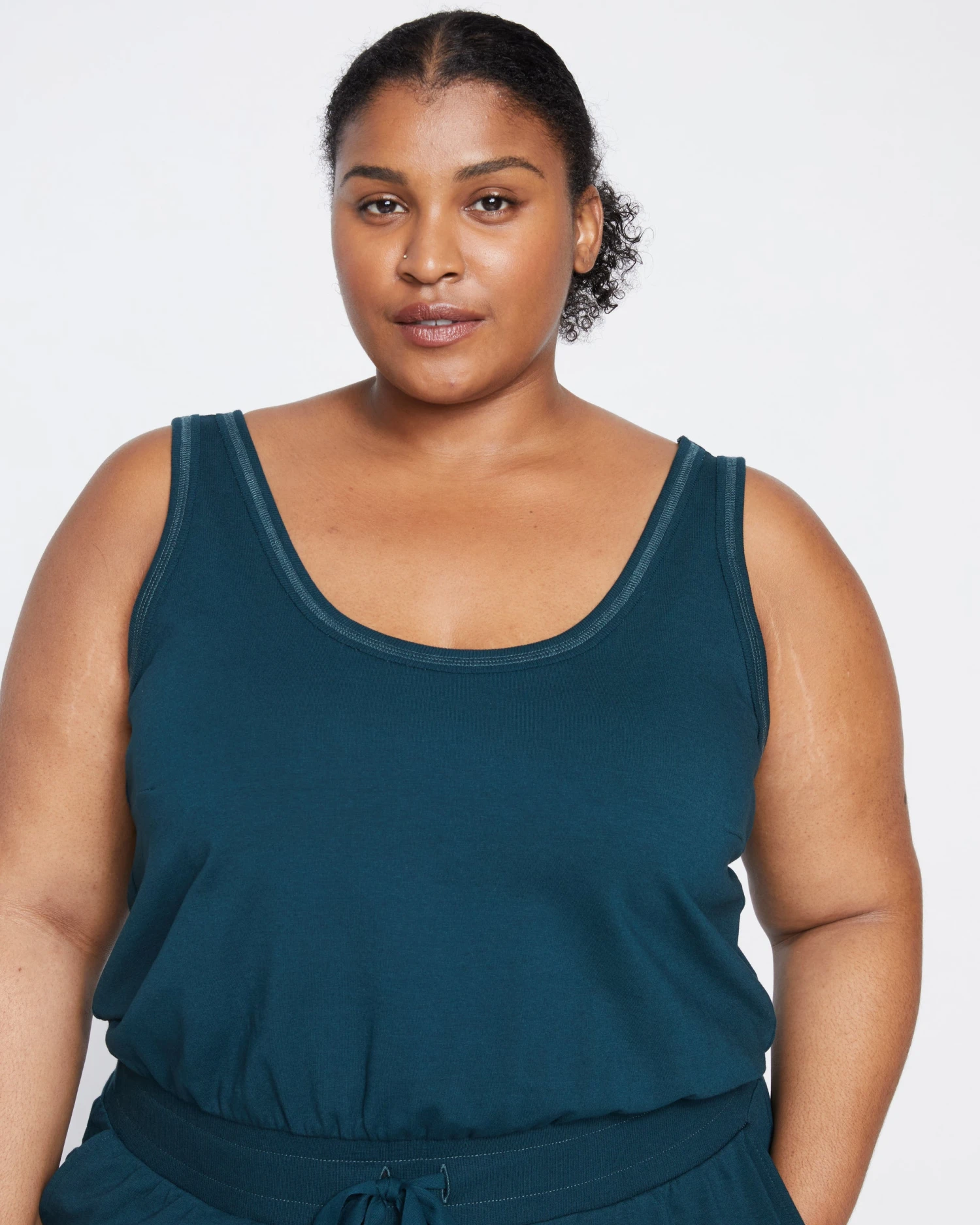 A one piece wonder. Your easiest everyday uniform. Slip into this sleeveless jumpsuit for the comfiest outfit that looks like two pieces. It’s made from superfine French terry and the overall fit is skimming. The top features a scoop neck with ribbed trim and raw edge detailing, and a relaxed fit. The bottoms are jogger-style with a wide encased elastic waistband, drawstring, and ribbed cuffs. Oh, and it’s complete with convenient slash pockets.