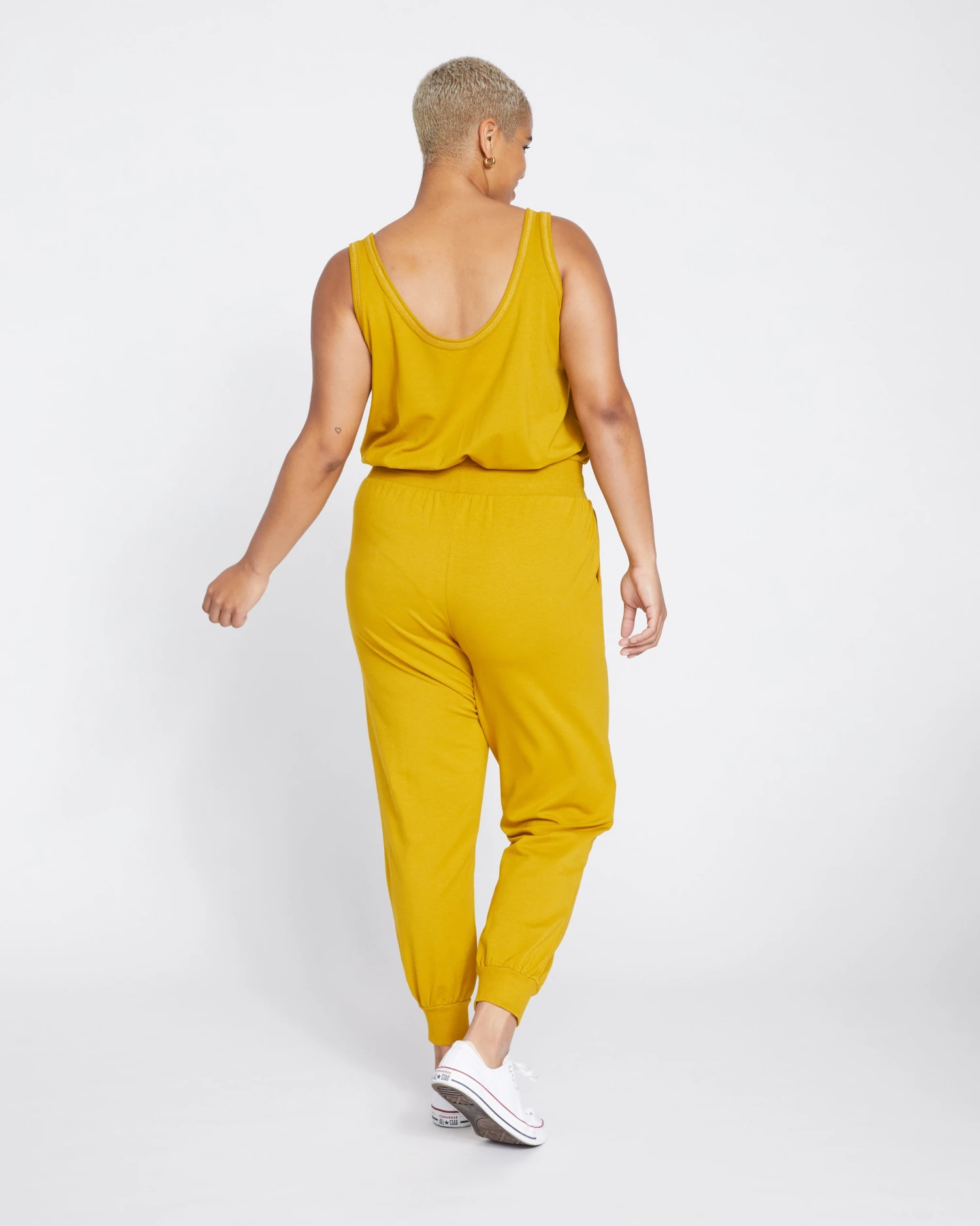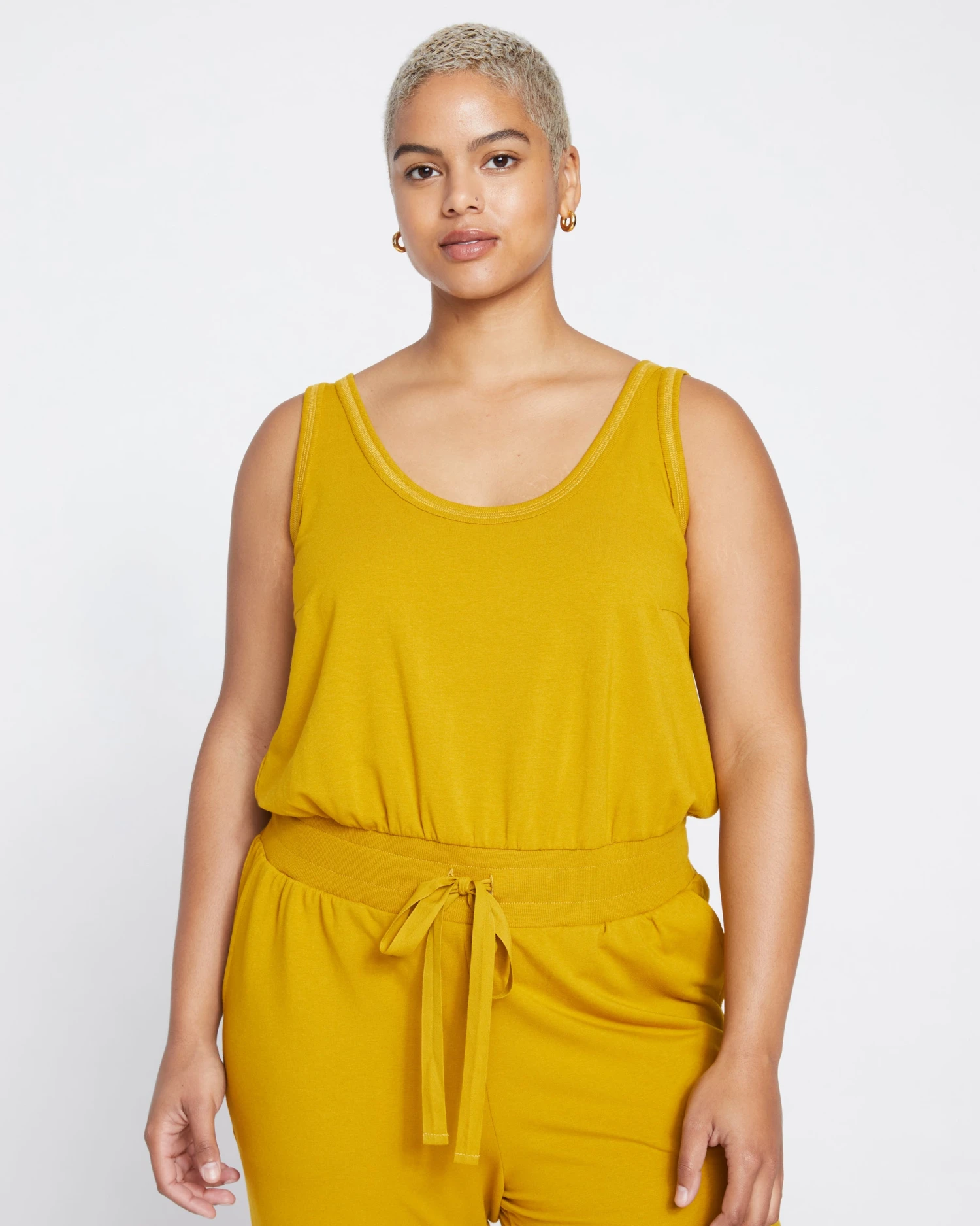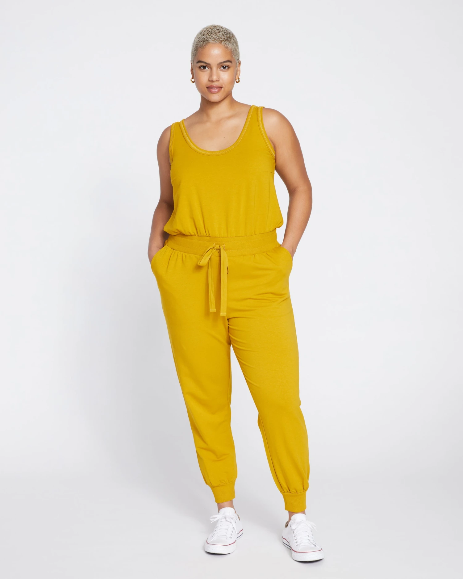 A one piece wonder. Your easiest everyday uniform. Slip into this sleeveless jumpsuit for the comfiest outfit that looks like two pieces. It’s made from superfine French terry and the overall fit is skimming. The top features a scoop neck with ribbed trim and raw edge detailing, and a relaxed fit. The bottoms are jogger-style with a wide encased elastic waistband, drawstring, and ribbed cuffs. Oh, and it’s complete with convenient slash pockets.