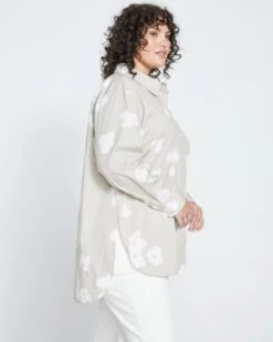 This is your ultra-chic roomy shirt. It’s elegantly oversized in a way that will make everyone wonder who you are and what you do. Cut from a painterly-printed poplin, this is your easiest value-down with an effortless look that’s both refined and relaxed. Additional details include the luxe enamel-coated values and hi-low hem. If you like a close fit, you may prefer to size down in this style.