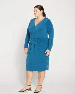 Get it twisted. As in, you need this dress. It’s made from our velvety-cool jersey that’s luxuriously smooth, soft, and silky. The body-hugging fit features a fun twist detail at the waist for gathering through the body. Additional details include the V-neckline and long set-in sleeves.