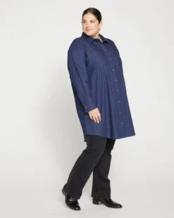 Your most versatile closet essential. This workwear-inspired, tunic-length shirt dress is made from our supremely soft stretch denim. It features an easy fit and comfortable set-in sleeves. Perfect over leggings, this layerable essential also looks great when styled open with jeans or pants. Key details include the chest pockets, curved hem, and unexpected patch pockets at the back!