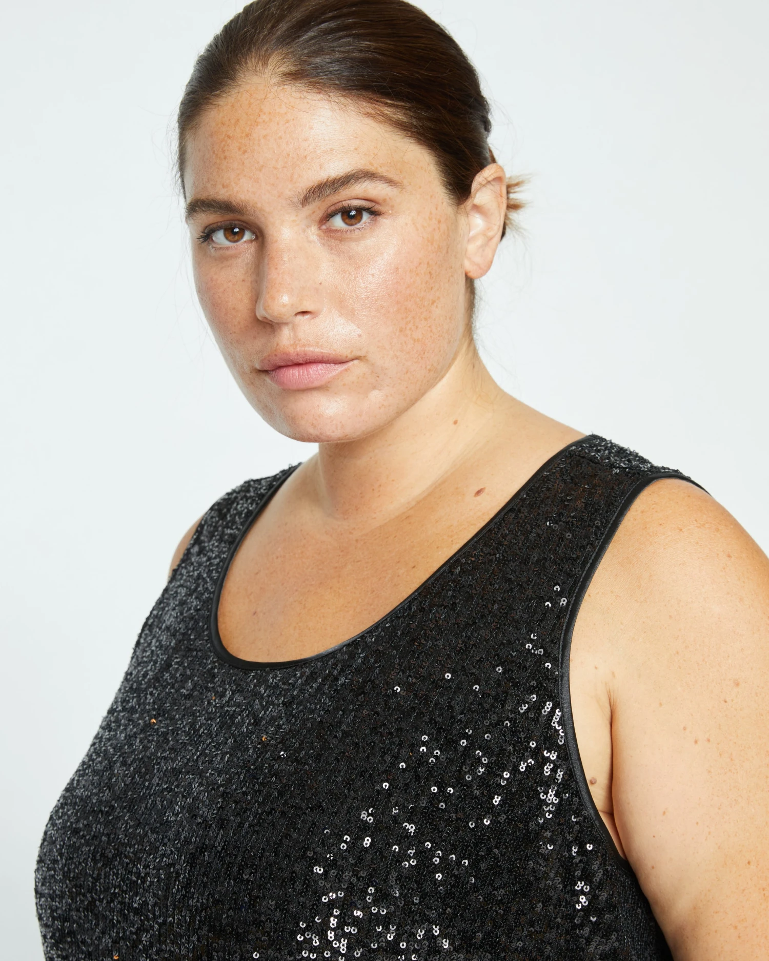 It’s your time to shine. This very special style was made for jazz clubs, cocktail hour, and holiday parties to come. It’s crafted from a sequin-adorned fabric and lined in our super soft and smooth liquid jersey. Easy yet elevated, the flowy, close-to-the-body silhouette features a scoop neck with a luxe binding finish and side slits at the hem. Wear yours with the Josephine Skirt for the full look.